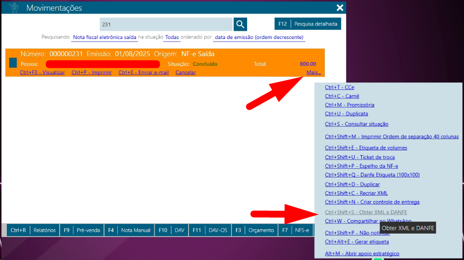 2. Pesquise a nota por numero, nome ou documento. Na opção MAIS/Obter XML e DANFE