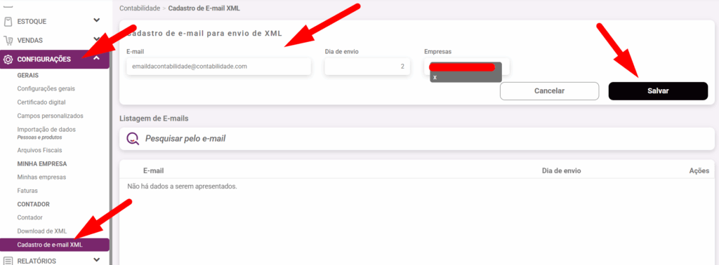 Para o contador receber os xml das notas, é necessario cadastrar o email.
