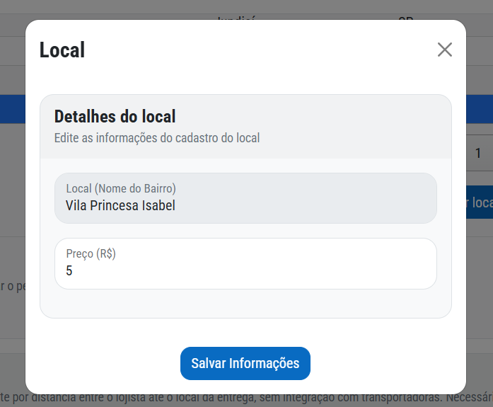 Para alterar o taxa de entrega. Selecione o bairro e clique em editar