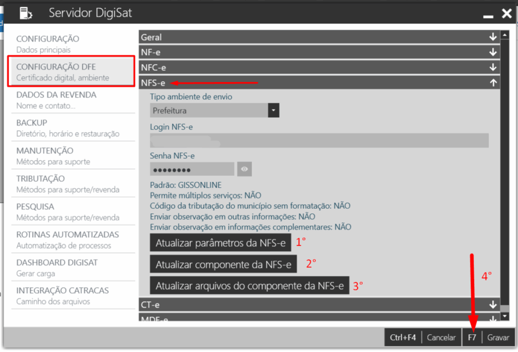 3 – Em CONFIGURAÇÃO DFE, clique agora em NFS-e. Execute agora cada processo de atualizar parâmetros seguindo a sequência da imagem abaixo e após todos os três processos concluidos clique em GRAVAR. Caso aparece alguma mensagem de processo em execução ou algum tipo de problema, feche o aplicativo servidor e tente novamente.