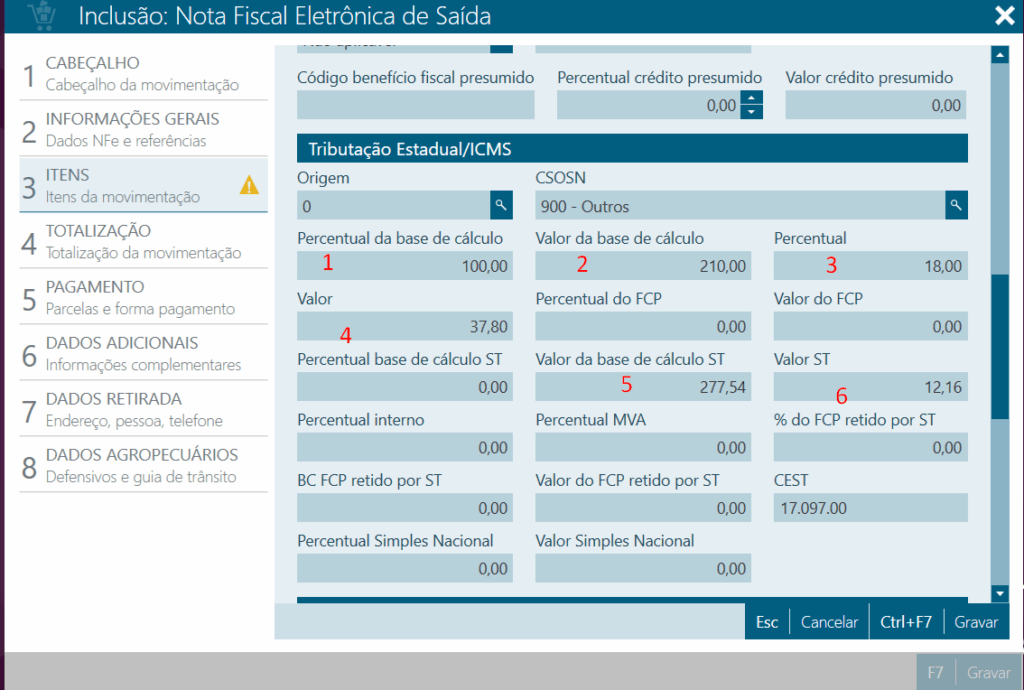5.Valor da base de cálculo ST= para calcular este valor é necessário fazer da seguinte forma: o valor da base de cálculo (210,00) + 32,16% (MVA) = 277,536 | a porcentagem do MVA deve ser consultada na nota de entrada.