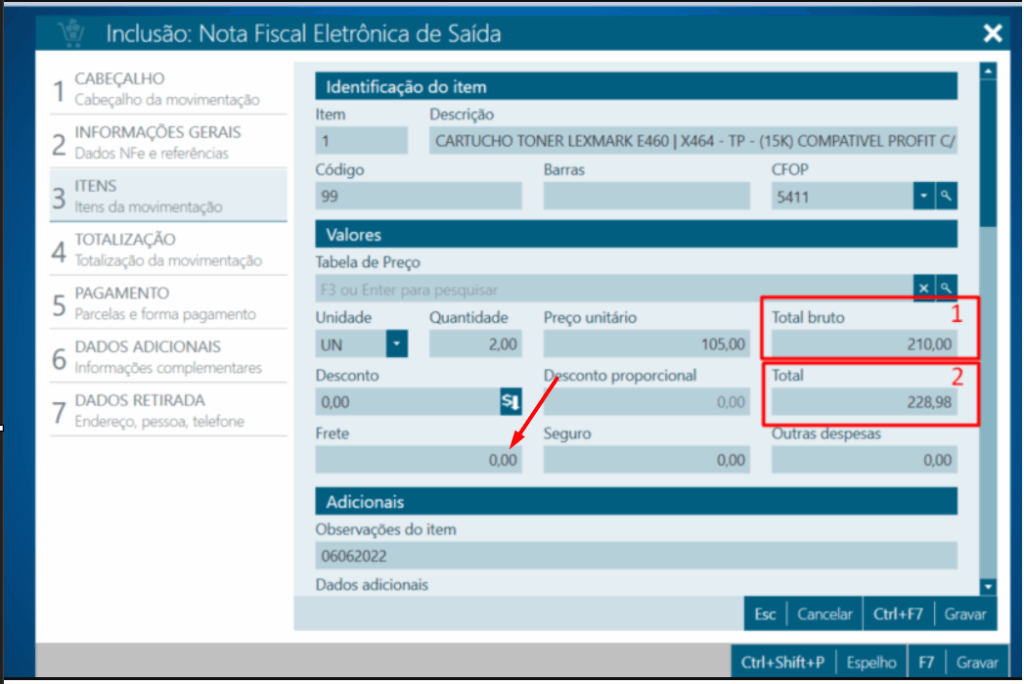 14. Caso o valor total não esteja batendo, preencha com qualquer valor o campo de frete e retire o valor, ao fazer isso você forçará o sistema refazer os cálculos no sistema.