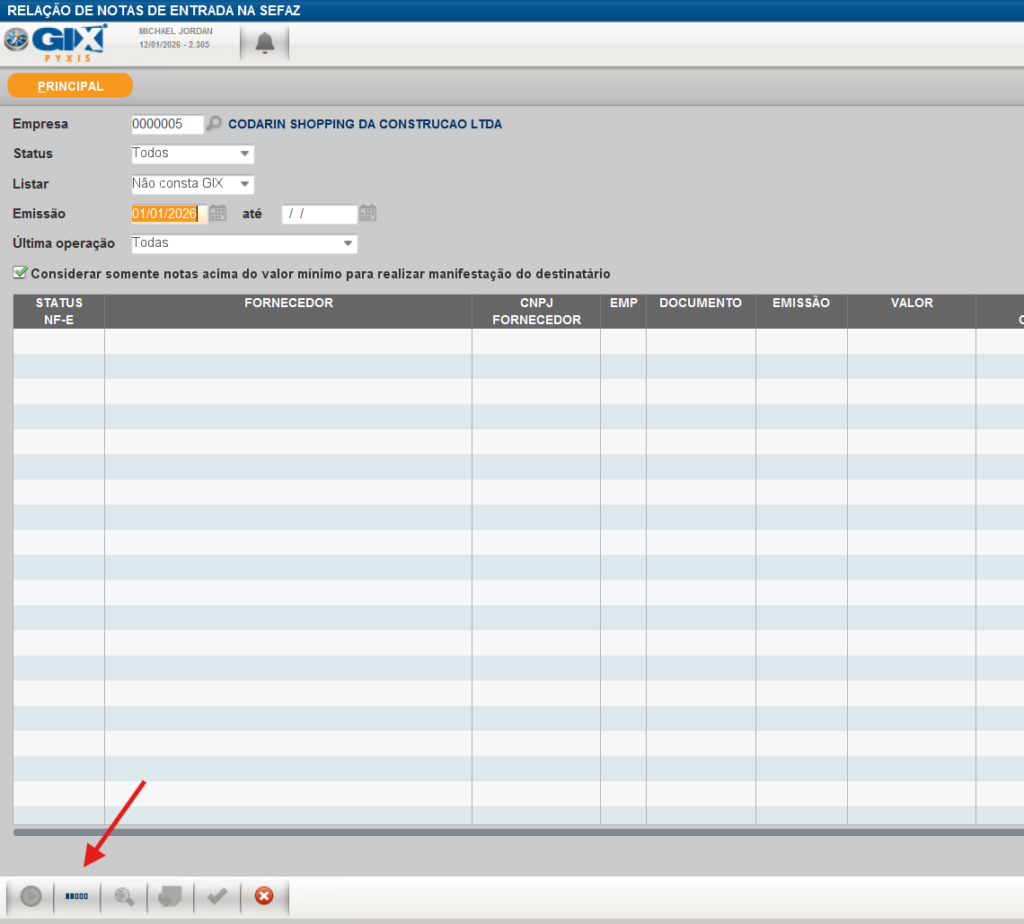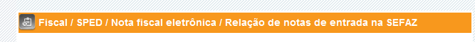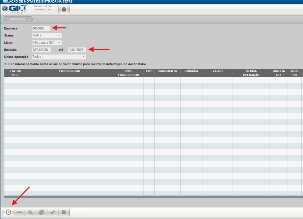 1 – Primeiramente clique no botão de play na tela de Relação de notas de entrada na SEFAZ, conforme imagem abaixo. Logo em seguida selecione a empresa e coloque os filtros necessários como o período de pesquisa.