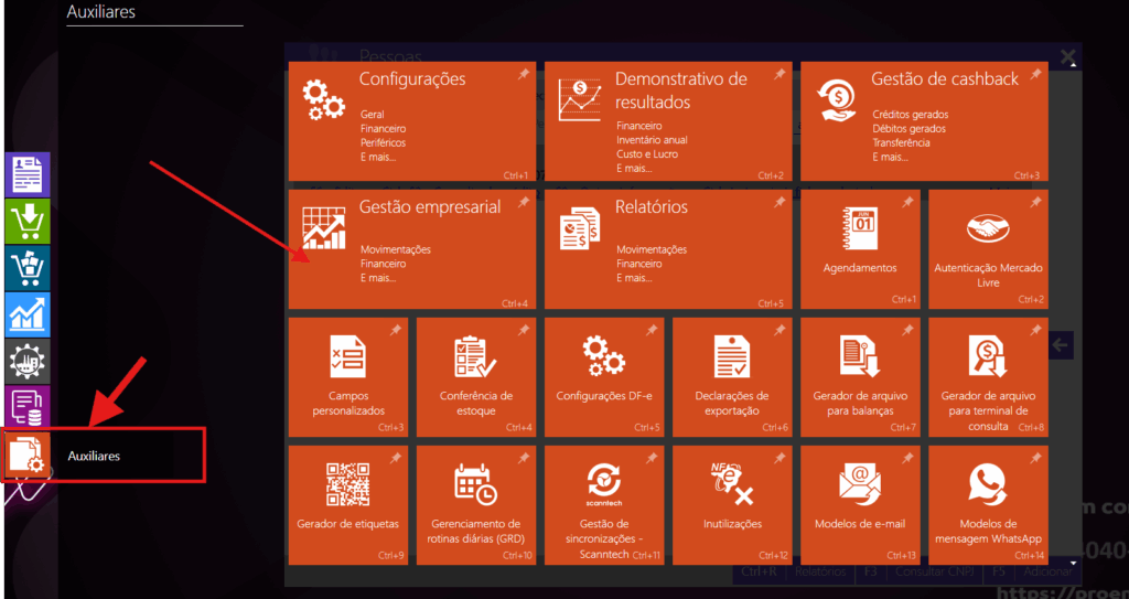 1 – Para saber quando um produto foi incluso, clique em AUXILIARES e depois em GESTÃO EMPRESARIAL