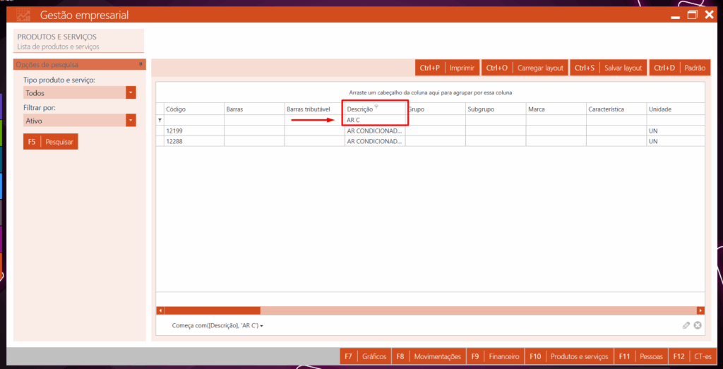 3 – agora procure o campo descrição, e digite o produto que você quer localizar conforme imagem abaixo
