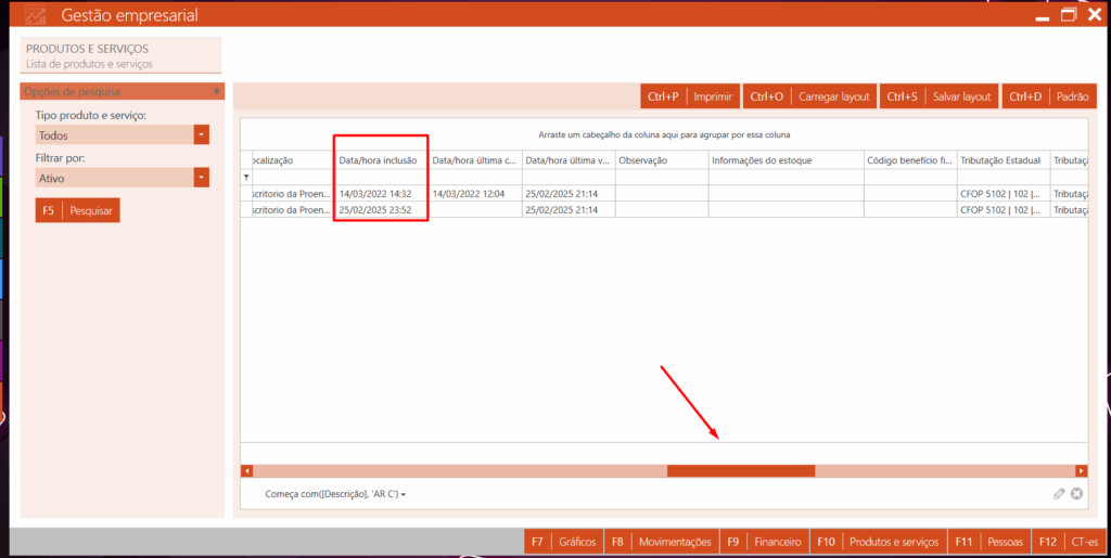 4 – agora arraste a visibilidade dos dados até localizar a informação de DATA/HORA DE INCLUSÃO