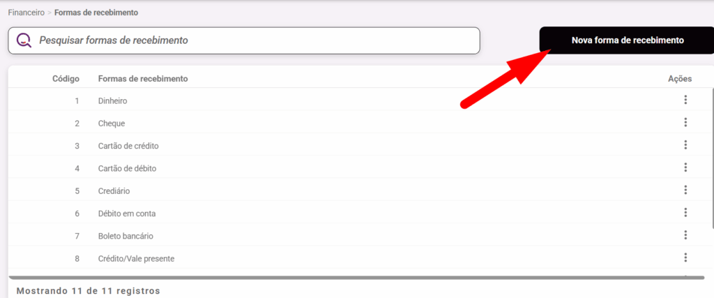 - O sistema ja vem com as forma mais usadas Dinheieo, Cartão, Boleto..