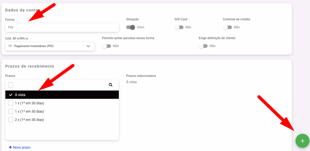 2. Digite o nome, codigo que vai na NF o prazo de recebimento. Para criar mais prazos.