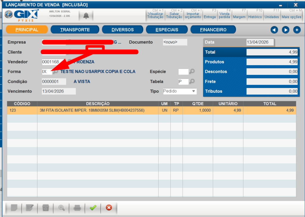 - Em lancamento de vendas, selecione a forma de pagamento IX (esta sendo temporario)