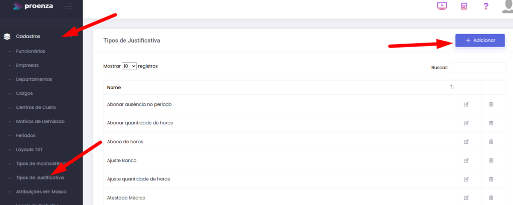 Para criar mais tipos de justificativa, siga o passo a passo abaixo. Lembrando que o sistema já contém as justificativas padrões.