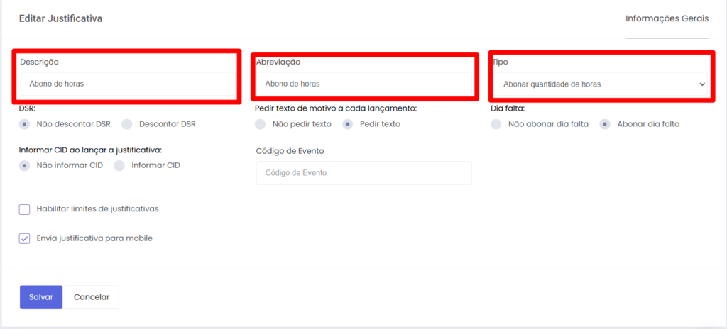 2. Digite a descrição da justificativa, abreviação e o tipo. No exemplo abaixo, estamos criando um abono de horas