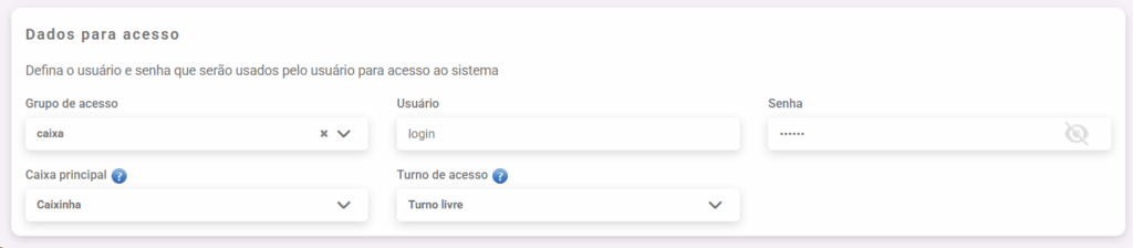 5. Aqui é a parte do login para acessar o sistema, digite o nome do usuario e a senha. Selecione qual grupo de acesso, craido no inicio