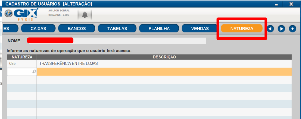7. Usuario da logistica/expedição. Na opção Natureza digite o codigo 035