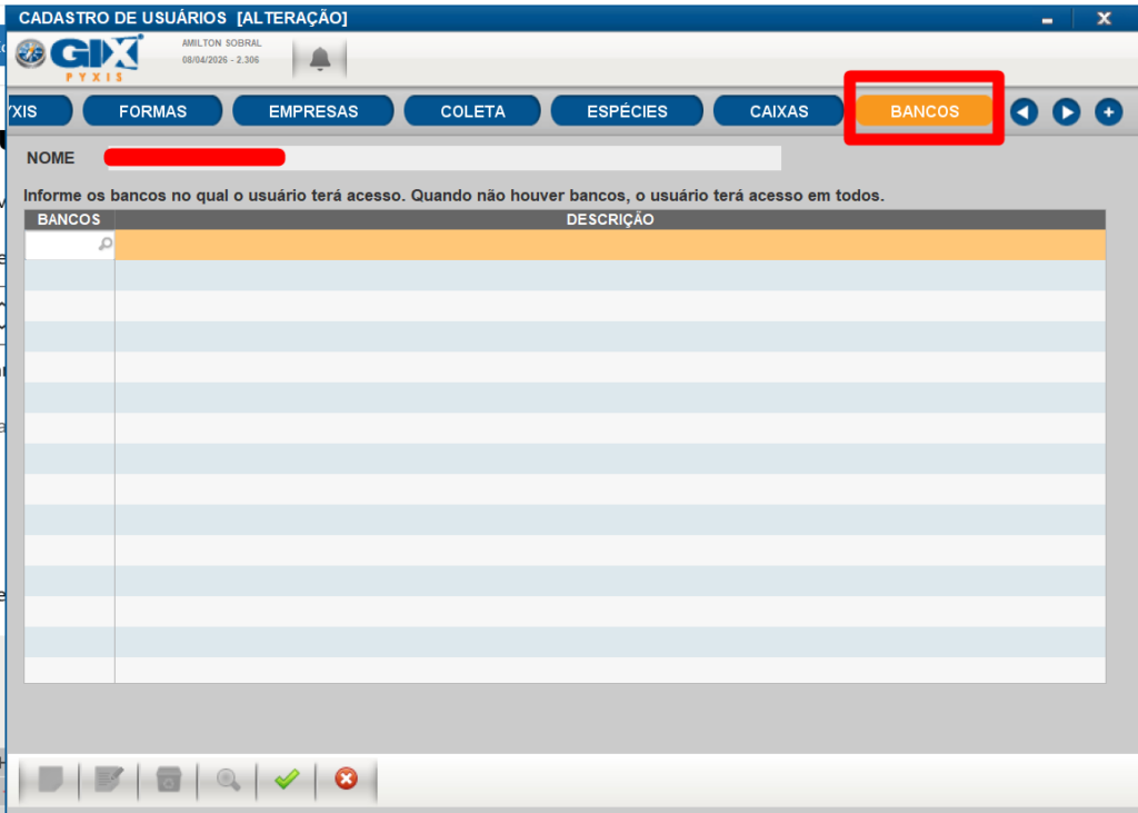 Usuario financeiro, contas a pagar e receber, necessario os codigos do bancos