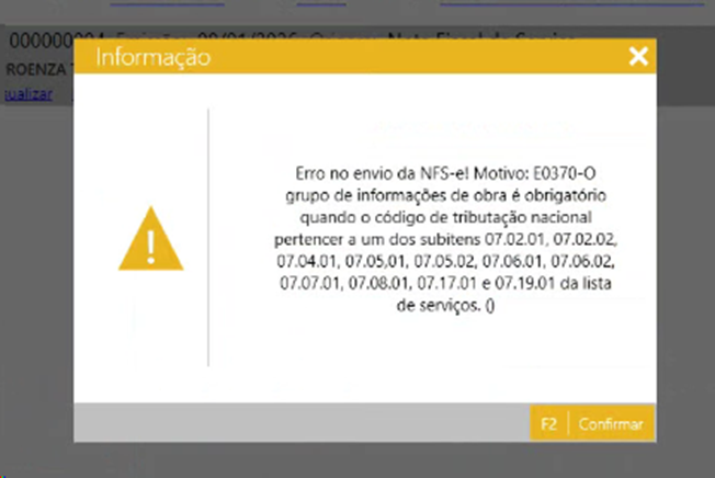 Erro no envio da NFS-e! Motivo: E0370-O grupo de informações de obra é obrigatório quando o código de tributação nacional pertencer a um dos subitens 07.02.01, 07.02.02, 07.04.01, 07.05,01, 07.05.02, 07.06.01, 07.06.02, 07.07.01, 07.08.01, 07.17.01 e 07.19.01 da lista de serviços. ()
