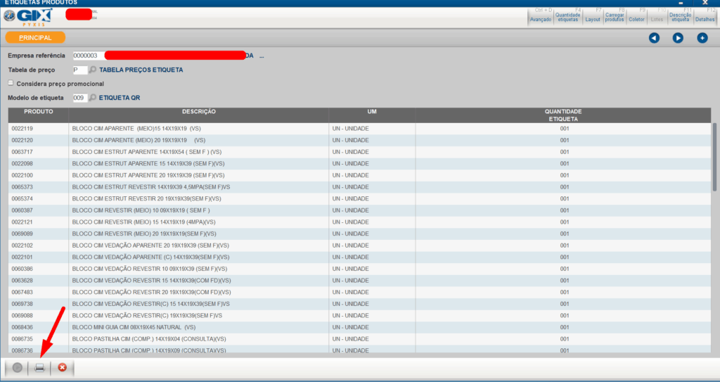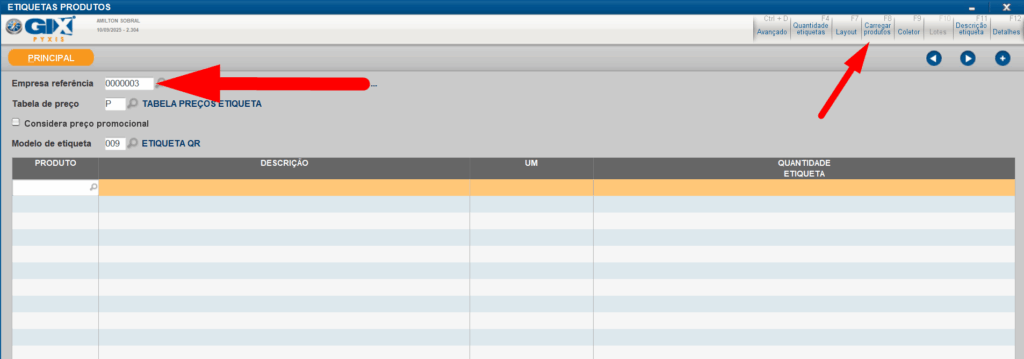 2. Digite o numero da empresa, tabela da etiqueta e modelo.