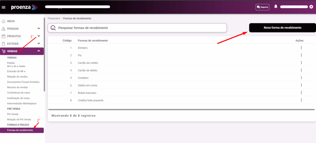 1 – Para ativar e inativar formas de recebimento/pagamento, clique em VENDAS, depois em FORMAS DE RECEBIMENTO.
