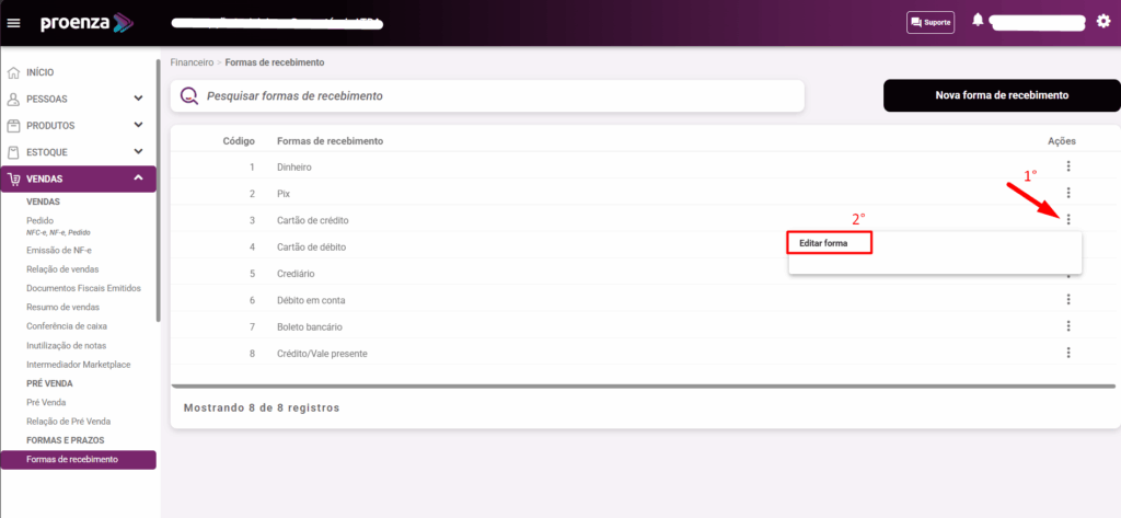 2 – para editar uma das formas de pagamento/recebimento clique nos 3 pontinhos e depois e clique em editar forma