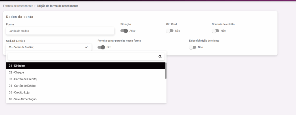 pode ser criado novas forma de pagamento clicando no botão NOVA FORMA DE RECEBIMENTO