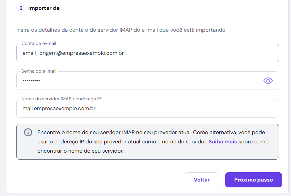 2. Apos criar a conta, vamos migrar os e-mails. Sera necessario o email, senha e servidor imap do e-mail origem