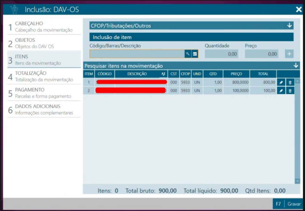 Lembrando que esse método não gera um documento fiscal, é apenas um registro para o sistema gerar financeiro e concluir a DAV-OS realizada.