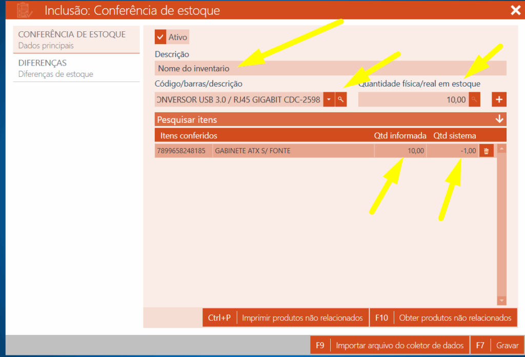 3° Na tela de INCLUSÃO poderá ser adicionado todos os itens do seu estoque e apontar a quantidade real que está em seu estoque. Realizando desta forma o sistema irá fazer um comparativo para obter a diferença conforme imagem abaixo